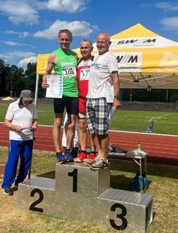 Der Tag begann für Alfred Just mit dem 100m-Sprint. Mit flotten 14,14sek sicherte er sich die Bronzemedaille knapp vor dem starken Gegner Ralf Petri aus Schweinfurt. Beim anschließenden Weitsprung bewies Alfred in einer Sprungserie von 4,59m, 4,48m und 4,54m seine gute Form. Deshalb ist es wirklich Pech, dass ihm die Goldmedaille verwehrt blieb: Der erstplatzierte Ralf Petri zeigte schwache Sprünge bis auf den letzten. Und der war um einen Zentimeter weiter als Alfreds bester mit 4,59m. Trotzdem ist Alfred zufrieden: Außer Silber in der Tasche hat er auch die Norm für die deutschen Meisterschaften erfüllt.