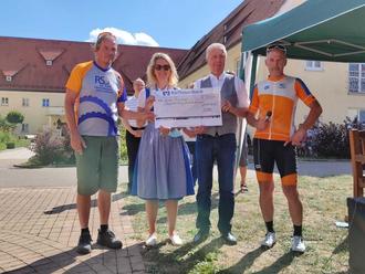 Zurück in Dinkelscherben war es für die Hospitalbewohner und die Gäste des Förderverein-Helferfestes eine große Überraschung, als plötzlich so viele Radler in den Garten einfuhren. Nachdem alle mit Kaffee, Kuchen und kalten Getränken wieder gestärkt und erfrischt waren, stand natürlich noch der Höhepunkt des Tages auf dem Programm: Die Scheckübergabe mit dem erreichten Spendenerlös, der sich aus der Startgebühr der Fahrt ergab. Ganze 2000 € konnte der RSDD dem Förderverein Bündnis Hospital Dinkelscherben-Zusmarshausen und seinem ersten Vorsitzenden Josef Guggemos übergeben.