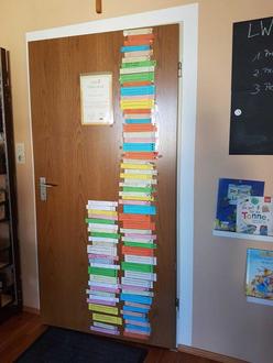 Am Freitag, den 16.09.2022 fand die Abschlussveranstaltung der Ferienaktion „Lesen-was-geht“ bei der Bücherei Häder statt. In diesem Jahr haben 10 Teilnehmer insgesamt knapp 100 Bücher innerhalb von 6 Wochen gelesen und diese auch bewertet. Das Büchereiteam hatte sich einen zusätzlichen Ansporn für die jungen Leser ausgedacht. Für jedes gelesene Buch durften die Leser einen symbolischen „Buchrücken“ mit Buchtitel und Autor beschriften und an die Innenseite der Büchereitüre ankleben und somit einen Turm „bauen“. Am Ende waren es 2 Türme mit einer zusammengefassten Höhe von 2,88 Meter – eine tolle Leistung.