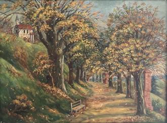 Zur Zeit im Zehentstadel ausgestellt: Herbst am Burgberg. Anna Stobitzer zeigt in diesem Gemälde den Dinkelscherbener Burgberg mit Burgkapelle, Kreuzweg und den noch jungen Bäumen in bunter Herbststimmung. Der Kreuzweg wurde in den 1840er Jahre auf Initiative des Dinkelscherbener Pfarrers Franz Xaver Egger errichtet.