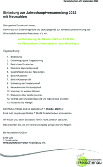 hiermit lade ich Sie termingerecht und satzungsgemäß zur Jahreshauptversammlung des Wirtschaftsfördervereins Reischenau e.V. ein. am Donnerstag, 20. Oktober 2022 um 19:30 Uhr ins Pfarrzentrum Dinkelscherben, Auer Kirchweg 2