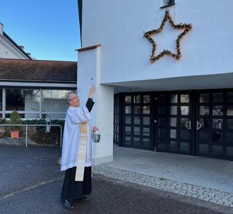 Passend zur Adventszeit spendet der Förderverein Bündnis Hospital Dinkelscherben-Zusmarshausen e.V. einen weihnachtlichen Stern der katholischen Kirche Dinkelscherben, der nun den Eingang der Simpertkirche ziert. Herfried Vogele hat ihn entworfen und gebaut. Pfarrer Kolbinger gab noch den kirchlichen Segen dazu. Jetzt kann es wieder Weihnachten werden.