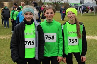 Als stärkste Mannschaft des Tages traten Matilda Hofhansl, Ronja Kraus und Hannah Unger auf. Sie mussten eine anstrengende Runde über 1,35km absolvieren und gewannen nicht ganz überraschend den Titel der WU14. Matilda (W13) absolvierte ihren ersten Crosslauf mit Auszeichnung: Sie lief mutig im Führungstrio mit, um dann 200m vor dem Ziel vorzupreschen und nach 6:23min als Gesamtsiegerin über die Ziellinie zu sprinten. Hannah gewann mit 7:00min Silber der W13 und Ronja erreichte Rang 5 der W12 in 7:13min.