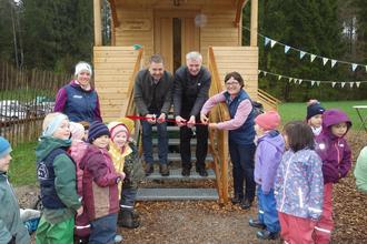 Pfarrer Martin Straßer, Bürgermeister Matthias Schlechter und Waldkindergartenleiterin Geli Frohwieser durchschnitten das Band vor dem neuen Waldwagen und gaben diesen zur Besichtigung für alle Besucher frei. Mit einem gemütlichen Beisammensein bei Kaffee und Kuchen organisiert von den Waldeltern endete die schöne Einweihungsfeier.