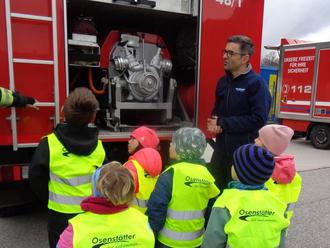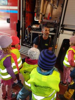 Einen Tag später durften die Vorschulkinder dann in die Feuerwehr in der Tiroler Straße kommen. Es standen ein Rundgang und die Fahrzeugbesichtigung auf dem Programm. In kleinen Gruppen konnten Stefan Huber, Mike Ruh und Max Friedrich ausführlich auf die vielen Fragen der Kinder eingehen und auch etwas Wissen zum Thema Brandschutzerziehung vermitteln. Als gelungen Abschluss wurden die Kinder im roten Auto zurück in der Kindergarten gefahren.