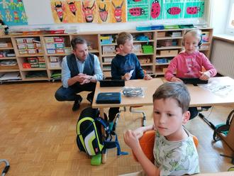 „Da müssen wir uns aber schon bedanken“, befand ein weiteres Kind. Eine „sehr gute Idee“, unterstrich denn auch die Lehrerin. Also wurde eine gemeinsame Einladung an das Rathaus geschickt mit der Bitte, der Bürgermeister möge vorbeikommen, damit die Kinder ihm ihren Dank aussprechen und bei der Gelegenheit auch gleich zeigen könnten, mit welcher Freude sie an den Computern arbeiten würden. Vor wenigen Tagen nun besuchte Matthias Schlechter die Kombiklasse 1 und 2.