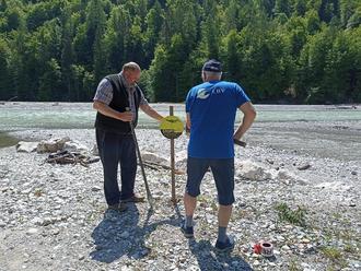 Flussregenpfeifer und Flussuferläufer nutzen die Kies- und Sandbänke an der Tiroler Achen, um dort ihre Jungen großzuziehen. Von uns Menschen werden die Kiesbrüter oft übersehen, da sie sich auf den Kiesbänken gut tarnen. Deshalb weisen auch in diesem Jahr wieder Hinweisschilder an den Kiesbänken auf die brütenden Vögel hin, um zu verhindern, dass die sensiblen Bereiche betreten werden.