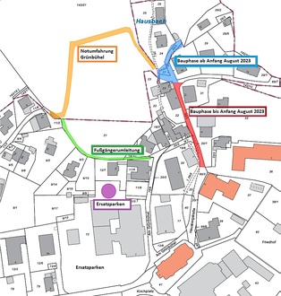 Die untenstehende Grafik gibt einen Überblick über die Bauabschnitte 2023, die eingerichtete Notumfahrung für Anlieger und Rettungsdienste sowie die Fußgängerumleitung von „Am Grünbühel“ zum Barfußpark bzw. Wasserfall (Klettersteig) und Ersatzparken für die Anlieger der oberen Hausbergstraße.