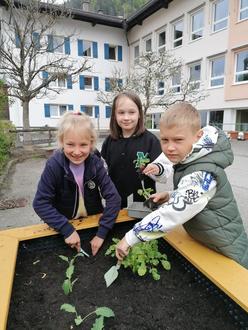 Als das Wetter endlich mitspielte, ging es sofort los. Ausgerüstet mit Erde und Schaufel bepflanzte die 2. Klasse die Hochbeete und Töpfe mit Kohlrabi, Radieschen, Tomaten, Schnittlauch und Kapuzinerkresse. Für jedes Kind der Grundschule wurde sogar eine gelbe Rübe gepflanzt.