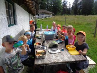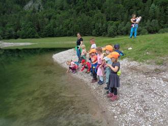 Passend zum Thema Wasser machten die Waldkinder einen Ausflug zum Lödensee. Doch nicht nur das feuchte Nass stand im Vordergrund sondern ein Waldkind feierte seinen Geburtstag hier in einer Almhütte. Mit Geburtstagslied, Geschenkritual und Besuch vom Igel Knopfauge ging die Party los. Gut gestärkt mit Brotzeit und Muffins starteten die Kinder dann zum Erkunden der Umgebung. Im See wurden Fische, Enten und Babyfrösche entdeckt und auf der Wiese so manches Stoamandl und ein Märchenbrunnen gebaut. Steile Bachstufen wurden gemeinsam erklommen und Frau Hauser kochte uns aus gesammelten wildem Thymian einen sehr schmackhaften Tee. Die Zeit verging wie im Flug und schon bald mussten wir wieder die Heimfahrt antreten. Vielen Dank an Theresa Hauser für die Organisation.
