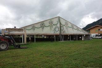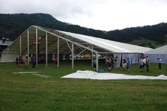 Das große Festzelt für das Gaufest des Chiemgau-Alpenverbands in Reit im Winkl steht. Dank den vielen freiwilligen Helfer des ausrichtenden Trachtenvereins „Dö Koasawinkla“ und der umsichtigen Arbeit ihres „Chefs“, des Zimmerermeisters Hansi Wolfenstetter, lief am Hauptaufstellungstag zwei Wochen vor Beginn des Zeltbetriebs alles bestens. Sehr umfangreich werden auch noch die folgenden Innenarbeiten einschließlich Bühnenaufbau in den kommenden Tagen sein. Das 4700-Mann-Zelt ist 100 mal 30 Meter groß, dazu kommen noch die Nebenzelte für den Verkauf von Kaffee und Kuchen, für die Bar und die Küche. Jetzt freuen sich alle auf den Festsonntag am 30. Juli und den Zeltbetrieb vom Bieranstich am 27. Juli bis zum Gaupreisplattln am Sonntag, 6. August.