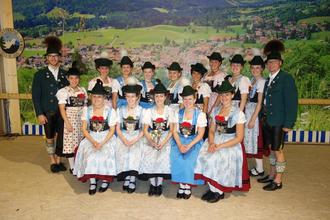 Die 14 bestplatzierten Dirndl und somit Mitglieder der kommenden Gaugruppe zusammen mit den beiden Gauvorplattlern Michi Memminger aus Marquartstein (rechts) und Franz Weingartner aus Bernau. (vorne Mitte die drei Erstplatzierten Dirndl)