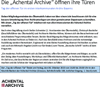 Nach einer Begrüßung durch Stefan Schneider (1. Vorsitzender des Ökomodells), Christoph Bauhofer (Geschäftsführer des Ökomodells) und Archivarin Martina Höhne, können sich die BesucherInnen auf verschiedene Programmpunkte freuen. Bei der Besichtigung des Magazinraumes wird erläutert, was in den Achental Archiven zu finden ist. Auch das Berufsbild eines Archivars und die notwendige Ausbildung werden thematisiert. Ergänzend ist eine kleine Ausstellung diverser Archivalien zu sehen und auch ein Mitmach-Angebot (nicht nur für Kinder) zum Thema „Deutsche Schrift“ steht auf dem Programm.