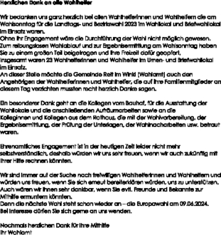 An dieser Stelle möchte die Gemeinde Reit im Winkl (Wahlamt) auch den Angehörigen der Wahlhelferinnen und Wahlhelfer, die auf ihre Familienmitglieder an diesem Tag verzichten mussten recht herzlich Danke sagen.