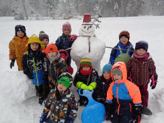 Große Schneekugeln wurden über die Wiese gerollt und aufeinander gebaut. Alle Kinder halfen tatkräftig mit und so entstanden zwei kindergroße Gestalten. Ein Schneemann und seine Schneefrau. Zum Schluss war nur noch wenig Schnee auf der Grashüpferwiese übrig aber zum Glück schneite es ein paar Tage später gleich wieder und so wurden die Schneerutscherl rausgeholt und der Rutschhügel auf seine Tauglichkeit getestet.