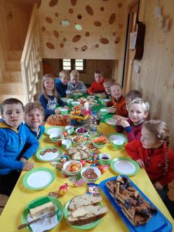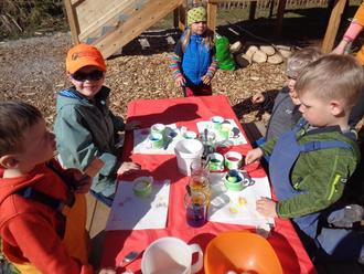 Am Tage der Osterfeier brachten alle Kinder etwas von zu Hause mit und gemeinsam wurde ein festliches Osterfrühstück abgehalten. Auch der Osterhase überraschte die Loferwichtel und legte nicht nur in die selbstgebastelten Osterkörbchen etwas hinein sondern versteckte sie auch noch im Wald.