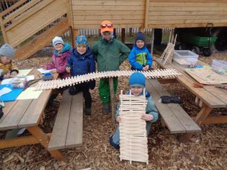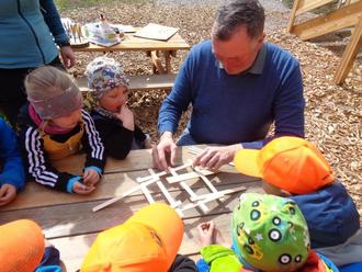 An einem Donnerstagvormittag überraschte uns Andreas Heigenhauser/ Naturwärme Reit im Winkl, mit einer großen Kiste gefüllt mit Holzstäben. Neugierig scharrten sich die Loferwichtel um ihn, er zeigte uns mit viel Geduld wie man aus den Stäben eine sich selbsttragende Brücke bauen kann. Fingerspitzengefühl war gefragt, ebenso wie Konzentration und Geduld. Gemeinsam entstand dann tatsächlich eine Leonardo-Brücke. Die Kinder hatten aber auch noch sehr viele eigene Ideen und so konnten die Eltern mittags viele Kunstwerke bestaunen.