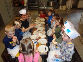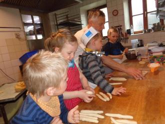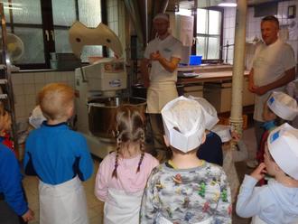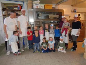 Nach den Osterfeiertagen durften die Kinder des Waldkindergartens die Backstube der Bäckerei Neumaier besuchen. Geführt vom Junior-Bäckermeister Benedikt trafen die Kinder pünktlich um 9 Uhr ein. Alle Loferwichtel wurden mit Schürzen und Bäckermützen ausgestattet und so ging es in zwei Gruppen los. Die erste Gruppe durfte gleich mit Pepperl in die Konditorei um Plätzchen auszustechen und zu verzieren. Der andere Teil machte mit Korbinian eine Führung durch die Backstube und das Lager. Dort wurden die Körner begutachtet und natürlich auch probiert. Anschließend bewunderten die Kinder die riesige Teigschüssel und schauten dieser beim Kneten zu. Der Teig kam anschließend in die Semmelstraße. Dort beobachteten Alle fasziniert, wie die Semmeln entstanden. Eine weitere Maschine formte im Nu gleichmäßige Teigkugeln aus denen die Kinder ihre eigenen Brezen, Semmeln und sonstige Kreationen machten. Diese wurden nach dem Ruhen mit Mohn, Sesam oder Sonnenblumenkernen bestreut. Als beide Gruppen ihre Arbeiten in der Konditorei und Bäckerei erledigten, gab es Brezen und Semmeln mit Butter, Marmelade und Saftschorle zur Stärkung. Alle gebackenen Teile und Plätzchen wurden zum Mitnehmen eingepackt und die Bäckergehilfen machten sich wieder auf den Weg nach Hause. Die Loferwichtel möchten sich nochmal bei der Familie Neumaier ganz herzlich für die kindgerechte Führung, die Brotzeit und den schönen Vormittag bedanken und wünschen alles Gute für die Zukunft.