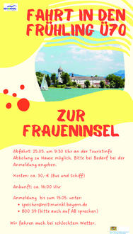 Am 25.05. möchten wir gemeinsam einen Tag auf der Fraueninsel verbringen. Wir fahren gemeinsam hin und wieder zurück. Auf der Fraueninsel selbst kann jeder unternehmen was er möchte. Von Spazierengehen, Kaffeetrinken, Mittagessen, Kirche besichtigen oder einfach nur die Ruhe genießen, kann alles dabei sein. Gemeinsam in der Gruppe oder alleine für sich, so wie es für jeden am angenehmsten ist.