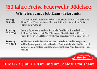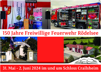 wir freuen uns mit Ihnen und Ihren Familien 150 Jahre Freiwillige Feuerwehr Rödelsee zu feiern. Der Kommersabend am Freitag, 31.05.2204 findet für geladene Gäste statt. Am Samstag, den 01.06. wird ab 14 Uhr sehr viel Unterhaltsames, Spiel und Spaß für Kinder, Jugendliche und die ganze Familie geboten. Spiel- und Actionday im Schlosshof mit Fahrzeugausstellung, großer Kinderspielstraße, Wasserspielen, Fahrsimulator und Schauübung sowie Musikbegleitung und Bewirtung.