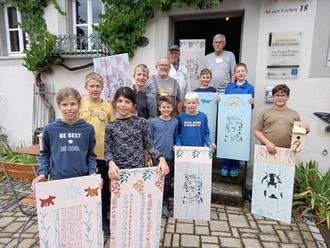 Beim Maler (Rudolf Wandler) konnten sie alte Maltechniken kennenlernen und selber mit Schablonen und Rollen Bildtafeln gestalten. Mit dem Schreiner (Reiner Östheimer) bauten sie einen Nistkasten. In der Schmiede (Luisa Köhler und Hanjo von Wietersheim) konnten sie - je nach Geschmack - einen S-Haken oder ein Herz fertigen.