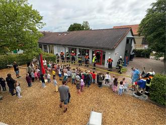 Vor ein paar Wochen haben wir unsere jährliche Feuerwehrübung abgehalten. Die Kinder wurden darauf vorbereitet, was im Ernstfall zu beachten ist. Wir haben den Notruf und das Verlassen des Hauses trainiert. Bei der Übung haben die Feuerwehrfrauen- und Männer zwei Kinder und eine Erzieherin gerettet. Nach dem Einsatz durften die Kinder bei den Löscharbeiten zusehen und Fragen an die Einsatzkräfte stellen. In Kleingruppen konnten wir das Feuerwehrauto und die verschiedenen Hilfsgeräte kennenlernen. Ebenso war ein Rettungswagen Vorort, dieser durfte auch von den Kindern erkundet werden.