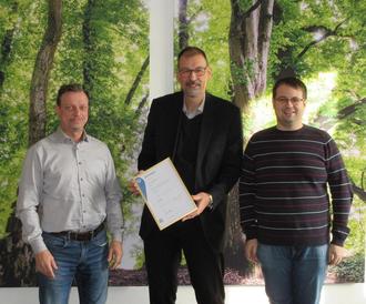 Freuen sich über die erfolgreiche Zertifizierung: Jürgen Hornik, Informationssicherheitsbeauftragter (Firma Mein-Datenschutzberater.de), Bürgermeister Mathias Stölzle und der Informationssicherheitskoordinator der Gemeindeverwaltung Stefan Hiller.