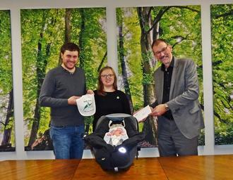 Erster Bürgermeister Mathias Stölzle hat der Familie Gerstlauer aus Schießen zur Geburt Ihrer Tochter Theresa am 10.01.2023 das erste nachhaltige Lätzchen überreicht - verbunden mit einer herzlichen Gratulation für die frisch gebackenen Eltern und den besten Wünschen auf viele freudige Stunden mit dem Nachwuchs.