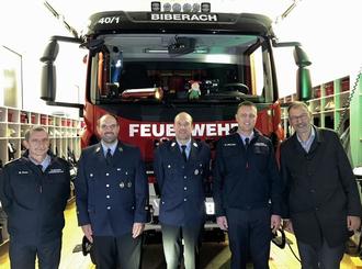 Von links: Kreisbrandinspektor Matthias Thuro, Kommandant Korbinian Simon, Stv. Kommandant Valentin Schmid, Kreisbrandmeister Holger Walter, Bürgermeister Mathias Stölzle – Foto Freiw. Feuerwehr Biberach