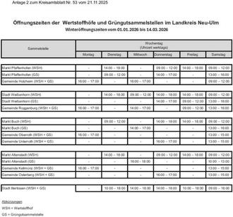 Bedingt durch die sich neu ergebenen Möglichkeiten aufgrund der Rückübertragung Abfallwirtschaft an den Landkreis Neu-Ulm hat die Firma Knittel den gesamten Tourenplan neugestaltet. Dadurch kommt es einmalig im Jahreswechsel 2025 / 2026 zu einem Leerungsabstand von drei Wochen, die anschließenden Leerungen finden dann wieder im gewohnten zweiwöchigen Rhythmus statt.