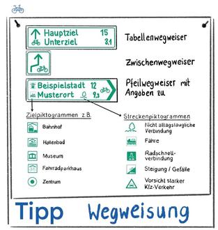 Piktogramme geben auf den Hauptwegweisern Details zum Ziel z. B. „Bahnhof“ oder zur Strecke z B. „nicht alltagstaugliche Verbindung“ an.