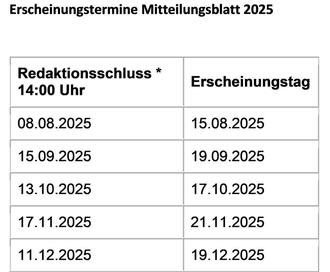 Zur Veröffentlichung Ihrer Beiträge benötigen wir Ihren druckfähigen Artikel möglichst als Word-Datei-Fließtext sowie Bilder (unbeschnitten) und Logos separat als Anhang. Bitte senden Sie Ihre Beiträge an die Mail-Adresse mitteilungsblatt@roggenburg.de