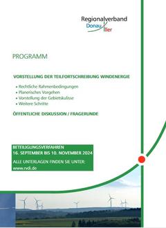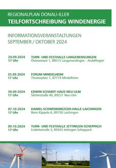Der Regionalverband Donau-Iller lädt im Rahmen der ersten öffentlichen Anhörung zur Fortschreibung des Kapitels Windenergie im Regionalplan in den kommenden Wochen zu öffentlichen Informationsveranstaltungen in der Region ein.