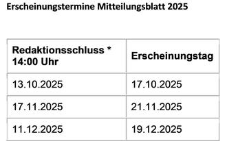 Zur Veröffentlichung Ihrer Beiträge benötigen wir Ihren druckfähigen Artikel möglichst als Word-Datei-Fließtext sowie Bilder (unbeschnitten) und Logos separat als Anhang. Bitte senden Sie Ihre Beiträge an die Mail-Adresse mitteilungsblatt@roggenburg.de