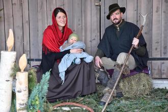 In diesem Jahr war der Stall mit der Heiligen Familie auf dem Dorfplatz, liebevoll hergerichtet mit Heu und Stroh, Esel, Ochs und Schäfchen aus Holz. Die Eltern Verena und Andi Hell saßen mit dem genau 6 Monaten alten Baby Kilian im Stall.