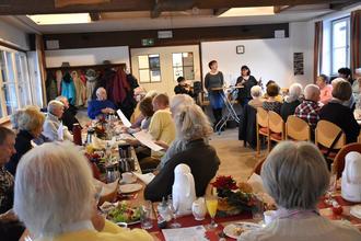 Nicht nur das Frühstück war gut, es gab auch ein besonderes Programm. Eingeleitet von Lukas Stolz, der mit seiner Geige den Auftakt mit „Alle Jahre wieder“ spielte. Uschi Ziegler forderte die Besucher auf, beim nächsten Stück „Leise rieselt der Schnee“ mitzusingen, wer nicht textsicher war, bekam einen Zettel. Dieser Aufforderung wurde offensichtlich sehr gern nachgekommen. Es breitete sich beim gemeinsamen Gesang eine wunderbare Stimmung im Raum aus. Der Blick nach Draußen fiel auf den mit Kerzen geschmückten Christbaum, gesteigert wurde das mit einer lustigen Geschichte, gelesen von Rüdiger Hergeth, die von einer Begegnung von einem Engelchen mit einem Teufelchen erzählte und einen lebensklugen Schluss bot. Genauso wie das nächste Narrativ, gelesen von Wilfried Stockberg, das ebenfalls mit einer wichtigen Botschaft endete, dem die meisten Besucher durch Kopfnicken zustimmten, nämlich die wirklich wichtigen Dinge im Leben möglichst frühzeitig zu erkennen.