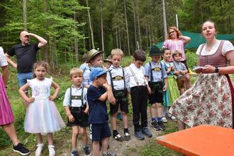 Schleching – Heuer hat der Waldkindergarten ein Maifest gefeiert. Irmi Klauser begrüßte die 17 Kinder mit ihren Eltern, Großeltern und Geschwistern. Sie hatte mit ihren Kolleginnen ein schönes Programm vorbereitet. Begonnen mit Trachtentänzen und musikalischer Begleitung von Sebald Bachmann an der Ziach, Verena Hebensteiner am Hackbrett und Hannes Prasser mit der Gitarre.