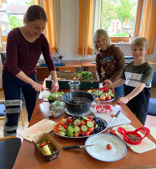 So heißt es im Mai, Juni, Juli immer dienstags in der ersten Pause für die Schlechinger Schulkinder. Im Dorfladen wird morgens eine Kiste mit verschiedenem Obst und Gemüse hergerichtet. Vor der ersten Pause wird alles gewaschen, geschnitten und appetitlich, kreativ und dekorativ präsentiert. In der ersten Pause werden die Köstlichkeiten von allen Kindern genüsslich verspeist. Das Ganze findet statt im Rahmen des EU-Schulprogramms und wird aus Landes- und EU-Mitteln finanziert. Kinder sollen Obst und Gemüse wertschätzen und ein gesundheitsförderliches Ernährungsverhalten entwickeln. Wir danken dem Dorfladen für das Herrichten, dem Elternbeirat für das Organisieren der Helferinnen und Helfer aus der Elternschaft und den Dritt- und Viertklasskindern für das Vorbereiten und Präsentieren. Alle helfen zusammen für unsere bunte Dienstagspause.