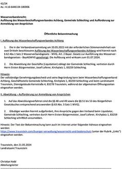 Wasserverbandsrecht; Auflösung des Wasserbeschaffungsverbandes Achberg, Gemeinde Schleching und Aufforderung zur Anmeldung von Ansprüchen