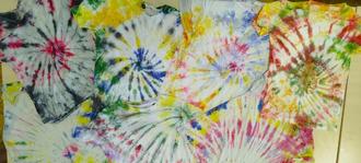 Jedes Kind darf ein weißes T-Shirt mit der „Spiraltechnik“ nach eigenen Wünschen farblich gestalten. Dazu gibt es 10 verschiedene Farbtöne, hochwertiger Stofffarben, die mit einer „Quetschflasche“ auf ein – zu einer Spirale gedrehtem – T-Shirt aufgetragen werden.
