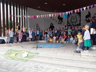 Der Wettergott war nicht gerade gnädig, als es genau zum Beginn der Vorführung der Kindergartenkinder anfing zu regnen. Aber das tat der Freude für das Sommerfest am Freitag, 16. Juni, keinen Abbruch. Die Kleinen standen auf der Bühne im Musikpavillon und begrüßten die zahlreichen Gäste mit den Singspielen Körperteil-Blues und „Wenn der Löwenzahn mit dem Gockelhahn“, passend dazu waren sie als Tiere verkleidet, mit ihrem selbst gebastelten Kopfschmuck.