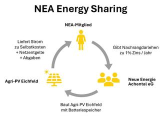 Eine absolute Innovation stellt das vom Vorstand entwickelte NEA Energy Sharing dar. Geboren wurde die Idee aus der häufig aufgeworfenen Frage, „ob man denn auch direkt Strom aus der Agri-PV-Anlage beziehen könne?“ Hierbei geben NEA-Mitglieder Nachrangdarlehen zu einem Niedrigzinssatz von 0,8 bis 1,0 Prozent pro Jahr auf 10 oder 20 Jahre und erhalten dafür ein Energiebezugsrecht aus der Anlage Eichfeld. Entsprechend der Laufzeit des Darlehens steht dem Mitglied ein festgelegtes Kontingent Strom aus der genossenschaftlichen Agri-PV-Anlage zu einem gesichert niedrigen Strompreis von 8 bis 10 Cent pro kWh (zuzüglich Netzentgelte, Abgaben) zur Verfügung. Auf diese Weise profitieren die Mitglieder vielfach, durch Zinserträge, durch einen attraktiven Strompreis und durch Gewinne der Genossenschaft.