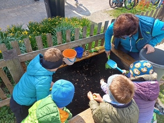 Zusätzlich wurden die Hochbeete wieder neu bepflanzt. Die Kinder dürfen sich auf das Ernten und Naschen von Radieschen, Zuckerschoten, Erdbeeren und Kapuzinerkresse freuen.