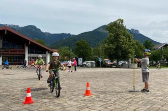 Munter, aber auch sehr konzentriert ging es wieder auf dem Dorfplatz zu, als die Grundschulkinder im Fahrradparcours ihre Geschicklichkeit und ihre radfahrerischen Fertigkeiten trainierten. Sitzt der Helm richtig? Kann ich mich vor dem Losfahren und beim Anhalten mit den Füßen sicher am Boden abstützen? Gelange ich über das schmale Brett ohne abzurutschen? Schaffe ich die Acht ohne Klötzchen umzuwerfen? Mit Erfolg mühten sich die Kinder, sie verbesserten sich von Runde zu Runde. Praktisches Üben mit dem Fahrrad ist ein wertvoller Bestandteil der Verkehrserziehung. Dank der Unterstützung der Eltern beim Bringen und Holen konnte jedes Kind mit seinem eigenen Fahrrad fahren. Die 3. und 4. Klasse baute den Parcours auf dem Dorfplatz auf. Umsichtig unterstützten die Älteren am ersten Trainingstag die jüngeren Schülerinnen und Schüler bei ihren Fahrübungen. Kontrolliertes Fahren, genaue Steuerung und richtige Kraftdosierung gelangen den Kindern immer besser. Was beim ersten Mal noch nicht klappte, gelang vielleicht am zweiten Tag und mithilfe eines Tipps der Mitschüler. Viel zu schnell vergingen die Radfahrstunden.