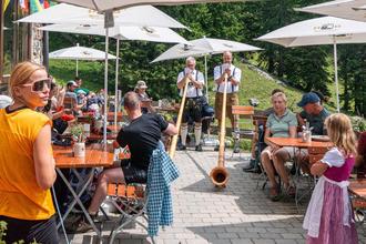 Aschau - Vor die Gaudi setzten sie die Arbeit – das galt für das Publikum wie für die Musiker. Rund 650 Höhenmeter mussten Wanderer und Radler am Samstagmorgen überwinden, um zur Priener Hütte zu gelangen, wo das Wammerl-Duo im Rahmen des Chiemgau Alm Festivals aufspielte. Dort wartete auf sie ein Konzert, das an musikalischer Vielfalt, Witz und Qualität kaum zu überbieten war. Auch für die Musiker war der Weg dorthin kein einfacher: „Unsere wöchentliche Probe dauert dienstags von 7.20 bis 7.40 Uhr“, verriet Johann Schmuck unter dem Lachen der Zuhörer. „Zuletzt auch öfter“, schob er hinterher. Was folgte, war ein überaus unterhaltsamer und zugleich beeindruckender Musikvormittag auf knapp 1400 Metern – mit Alphorn, Posaune, Jazz, Barock, Pop, Gstanzl und Loopmaschine.