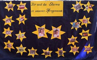 Es war der Sternenhimmel unserer Pfarrgemeinde zu sehen. Von den älteren Ministranten wurde erklärt, dass viele Sterne am Himmel leuchten, auch bereits 18 Ministrantensterne. Dann haben Kathi und Sophia ihre beiden Sterne hinzugefügt. Pfarrer Martin Straßer segnete die Kreuze und überreichte diese. Wir wünschen euch viel Spaß und gutes Gelingen bei eurem Dienst am Altar, mögen eure Sterne besonders hell leuchten.