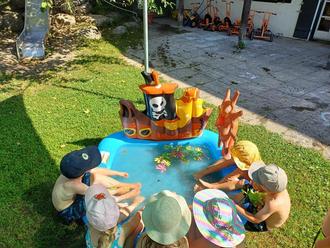 So kamen sie nun also ausgerüstet mit Badekleidung, Handtüchern und riesigen Spritzpistolen im Garten an und staunten nicht schlecht, als auf dem ganzen Grundstück verteilt verschiedenste Planschbecken, Wasserbomben, eine Rutschbahn, eine Wassersprinkler-Palme und eine Liegewiese für Handtücher aufgebaut waren. „Wie im echten Schwimmbad“, staunten die Kinder.