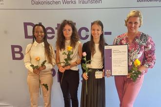 Auf dem Foto sehen Sie von links nach rechts: Linda Fischer, Luise Stopfer, Helene Jurkat (Schülerinnen der 12. Klasse) und Sandra Altmann (Leiterin des P-Seminars) bei der Preisverleihung in Trostberg.