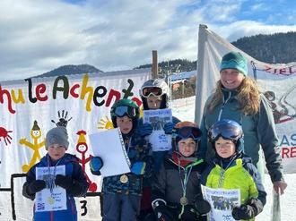 Am letzten Kurstag konnten die Kinder beim großen Abschlussrennen allen anwesenden Eltern und Angehörigen zeigen, was sie während der Woche gelernt haben und sind unter großem Jubel ins Ziel gefahren. Wie bei einem richtigen Skirennen gab es einen Lauf mit Toren und jedes Kind fuhr mit fachkundiger Moderation und den Anfeuerungen der Zuschauer ins Ziel. Natürlich erhielten alle eine Siegerurkunde und eine Goldmedaille bei der abschließenden Siegerehrung.