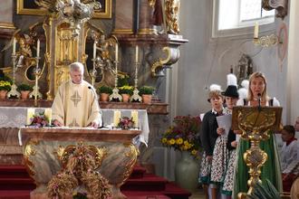 Schleching – Die Kinder strömten mit ihren Erntekörbchen zur Kirche und stellten sie am festlich geschmückten Altarraum ab. Pfarrer Martin Straßer freute sich über die vielen Gaben, den Erntedankkranz mit dem Brot, den Schmuck vom Almabtrieb und über die Trachtenkinder, die die Erntedank-Messe mitgestalteten. Er bezeichnete die Kirche an diesem Tag als ein „Schmuckkasterl“, besonders auch zu dem Patroziniums-Gottesdienst für den Heiligen Remigius.